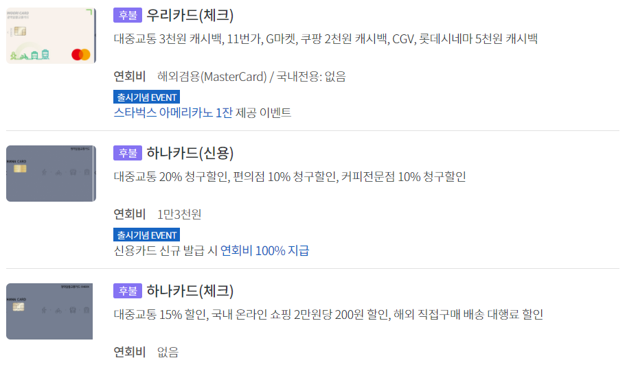 신한카드, 우리카드, 하나카드 중