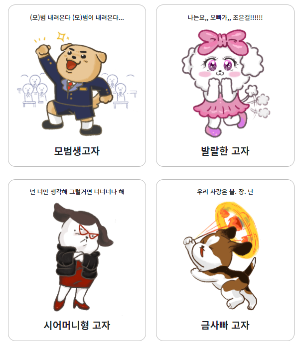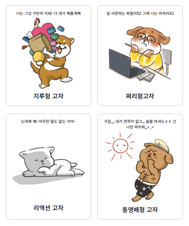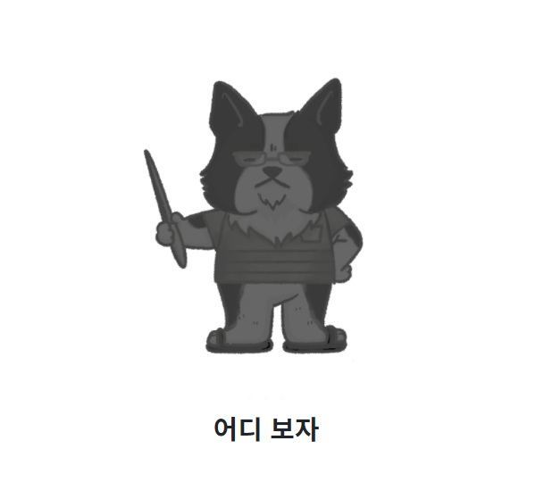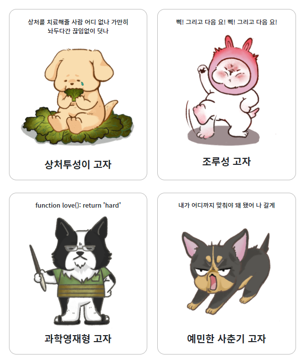 특성과 함께 그와 닮은 강아지 캐릭터를
